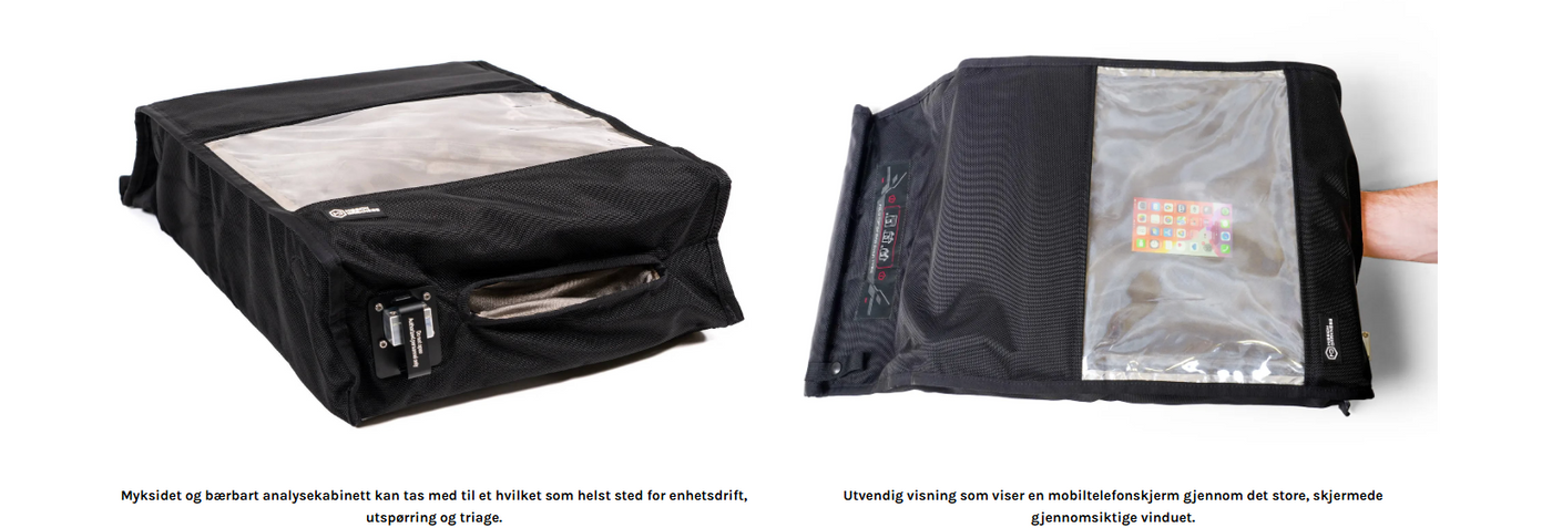 - For militære og kriminaltekniske undersøkelser: Myk, sammenleggbar analyseenhet designet for bruk av kriminalteknikere og militære for å utføre enhetsanalyse og datautvinning på stedet, samtidig som enhetene er skjermet mot RF-signaler.