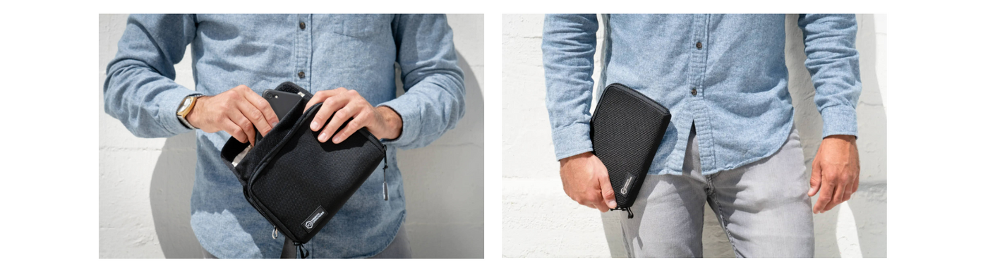 • Sikker lukking: Faraday-lommen forsegles med en fold-over-lomme med borrelås.