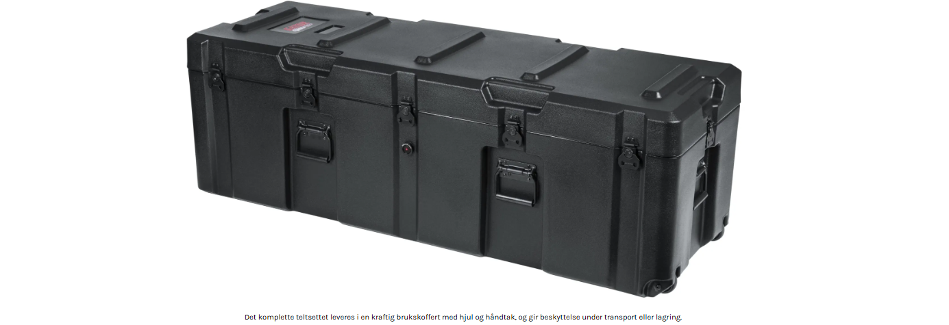 - Transportkoffert: 139,7 cm L x 43,18 cm B x 45,72 cm H; kan fraktes på pall eller i medfølgende koffert.