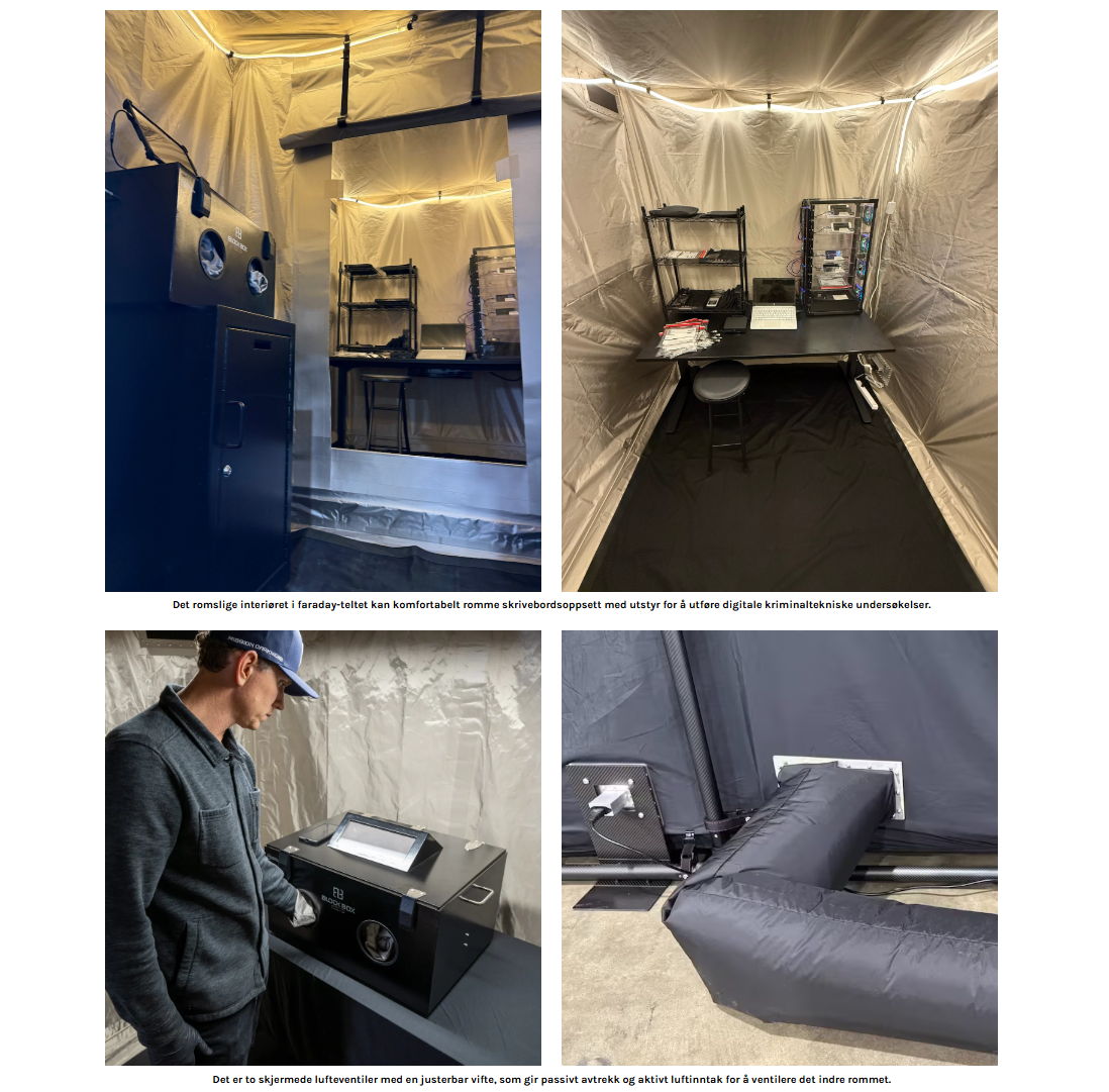 For intern tilkobling er teltet utstyrt med et skjermet filter som inkluderer én RJ45 Ethernet-port, én AC-strømport og to USB-porter, med mulighet for å tilpasse og legge til ekstra skjermede filterporter. Kompatible kabler og en strømskinne følger med i settet, noe som gjør teltet allsidig for kriminaltekniske undersøkelser og andre sensitive operasjoner som krever sikre tilkoblinger. Det er rikelig med plass inne til et skrivebord og utstyr, og takets omkrets er opplyst med en LED-lysstripe. En beskyttende gulvmatte gir demping og hindrer slitasje på stoffet.