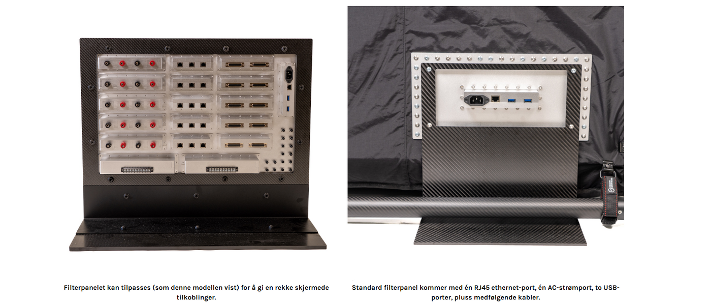 - Skjermede filtre: Ett RJ45 Ethernet-port, én AC-strømport og to USB A 2.0-porter som standard, med mulighet for flere tilpassede filtre.