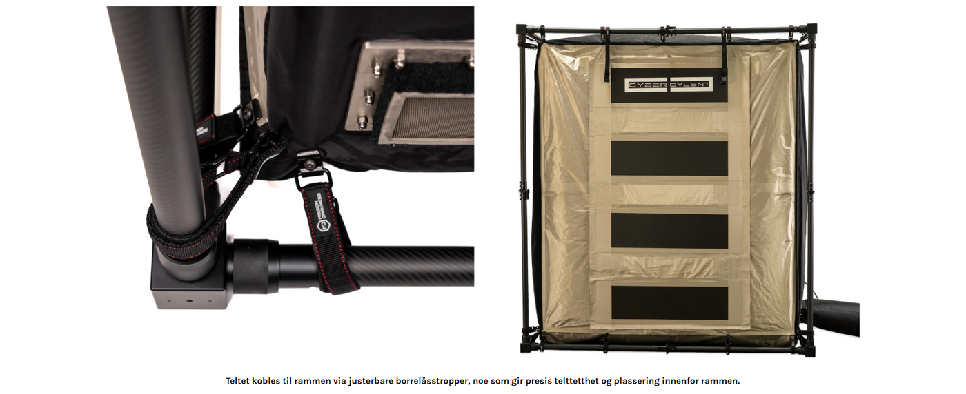- Justerbare stropper: Borrelåsremmer for presis stramming og posisjonering av teltet innenfor rammen.