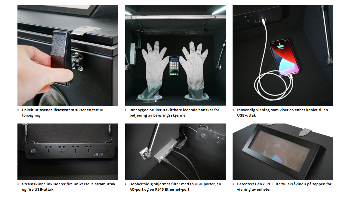 Kriminalteknisk analysekabinett: Betjen enheter og hent ut informasjon mens de er skjermet fra RF-signaler.