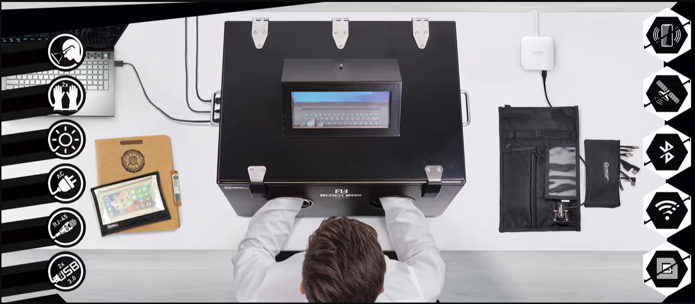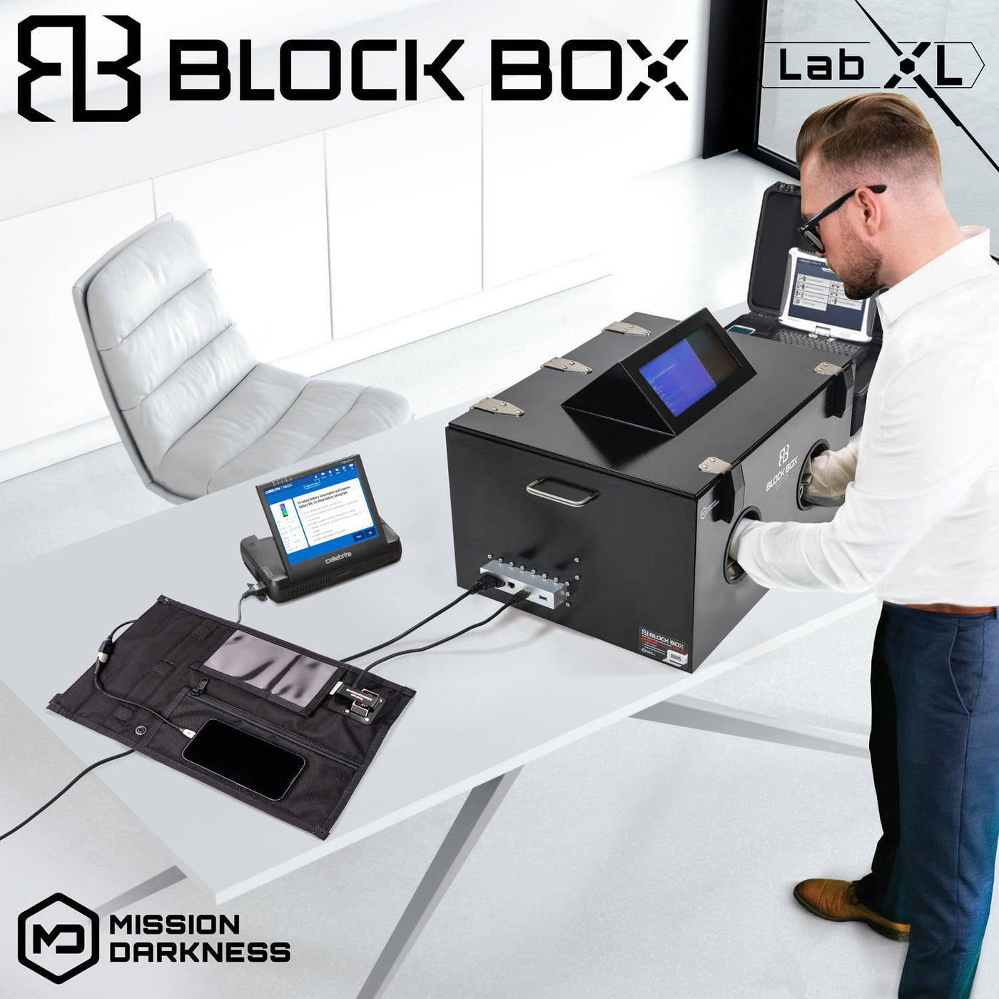 Mission Darkness BlockBox Lab XL er et avansert kriminalteknisk analysekammer som gir full RF-isolasjon og lar etterforskere operere og hente ut data fra elektroniske enheter som mobiltelefoner, nettbrett og bærbare datamaskiner. Med en rekke tilkoblingsmuligheter, høyhastighets datauttrekking og ubegrenset lading, forhindrer enheten låsemodus og maksimerer datatilgang. Det store, brukervennlige interiøret og omfattende tilbehør gjør den til en uunnværlig løsning for både felt- og laboratoriearbeid.