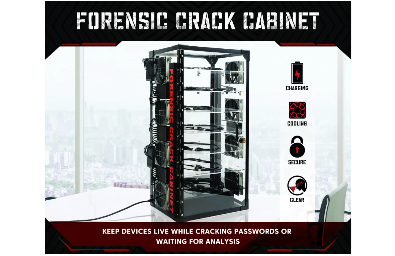 Mission Darkness™ Forensic Crack Cabinet løser flere utfordringer for kriminaltekniske etterforskere og laboratorier. For å effektivt få tilgang til og hente data fra mobiltelefoner og nettbrett, krever de nyeste kriminaltekniske verktøyene at enhetene holdes aktive frem til passord/passkode er knekt og datautvinning finner sted. Ofte kan det ta flere måneder før passordene er "knekt" eller analysen av enhetene starter. Dette kabinettet sørger for at enhetene holdes ladet, avkjølt, fysisk organisert og sikkert låst gjennom denne ventefasen før analysen og videre.