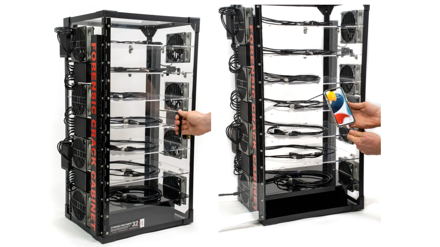 - Videoen viser hvordan Forensic Crack Cabinet brukes til å holde enheter skjermet mens de er koblet til passordknekking-verktøy og forberedelse til videre analyse.