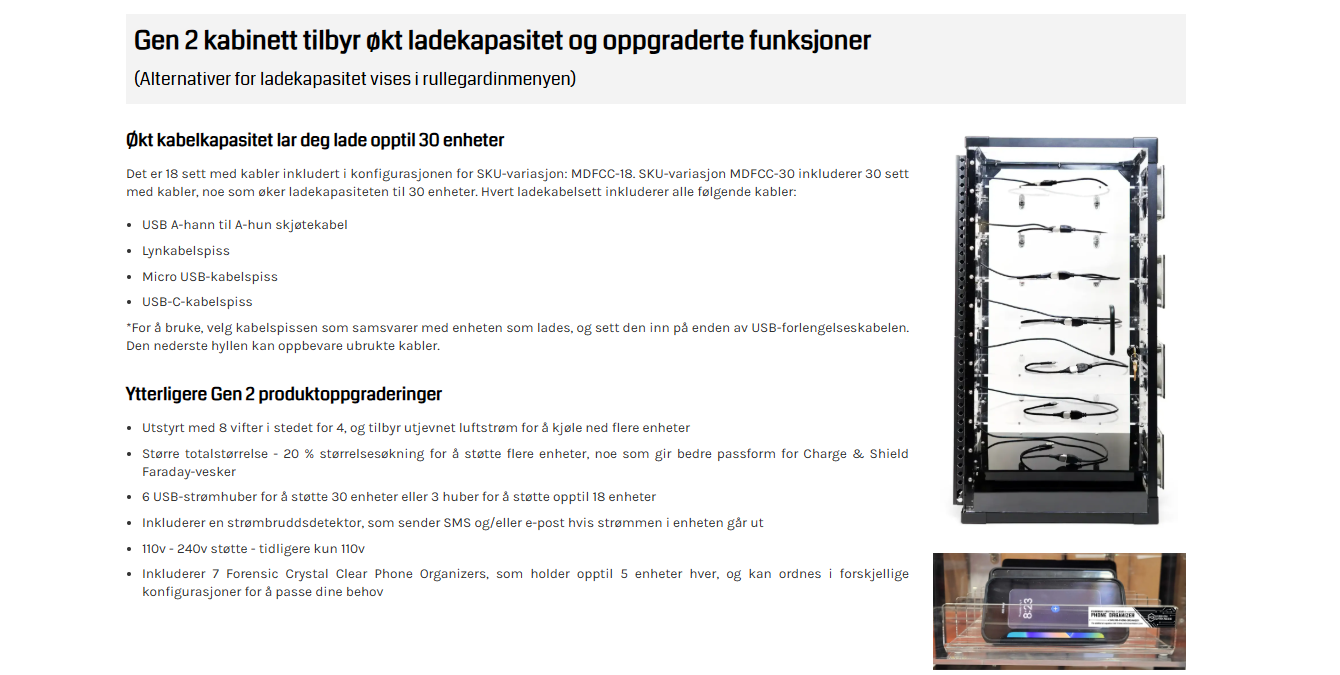 Dette gjør Gen 2-versjonen til en ideell løsning for større kriminaltekniske laboratorier som trenger å oppbevare, lade og organisere et stort antall enheter over lang tid.