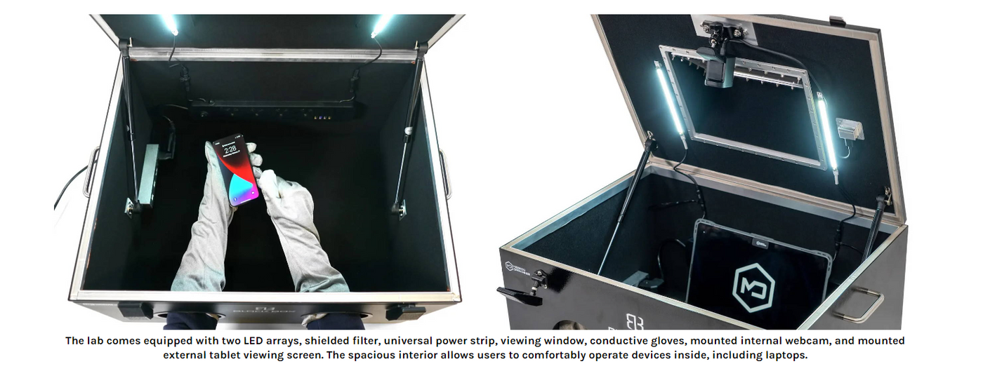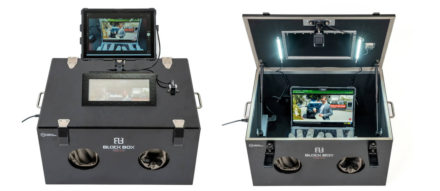 Mission Darkness™ BlockBox Lab XL med innebygd webkamera og nettbrett tilbyr avansert radiofrekvens (RF)-skjerming og praktisk tilgang for kriminaltekniske undersøkelser av elektroniske enheter. Dette forsterkede kabinettet bygger på standardmodellen BlockBox Lab XL, men inkluderer forbedringer som et integrert internt kamera og opplegg for en 13" nettbrettskjerm for visning. Det robuste kabinettet er spesifikt designet for å undersøke mobiltelefoner, nettbrett, bærbare datamaskiner og lignende enheter, samtidig som de holdes fullstendig skjermet fra RF-signaler.