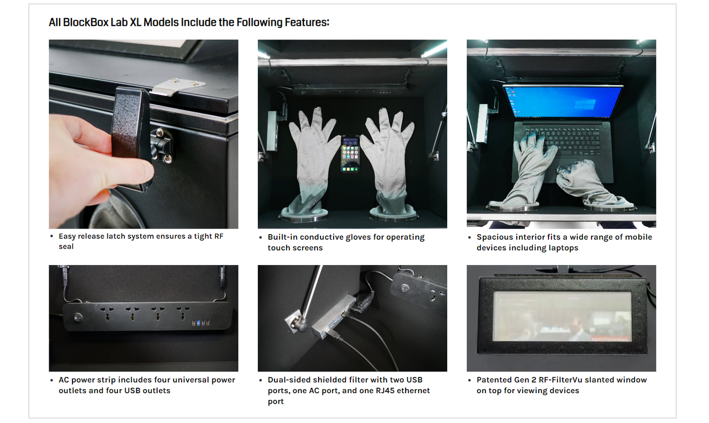 BlockBox Lab XL blokkerer WiFi (2,4 og 5GHz), Bluetooth, mobilsignaler inkludert 5G-nettverk, GPS, RFID og radiosignaler, og er laboratorietestet og sertifisert i henhold til IEEE 299-2006-standarder. Selv om det er designet for laboratoriebruk, er kabinettet lett nok til å transporteres til ulike lokasjoner takket være sterke håndtak. Det omfattende tilbehørsettet inkluderer høyverdige kabler, en gjennomsiktig telefonorganisator og hylle, erstatningshansker og skumforseglinger, samt Mission Darkness NeoLok Faraday-poser for sikker bruk med ledende hansker.
