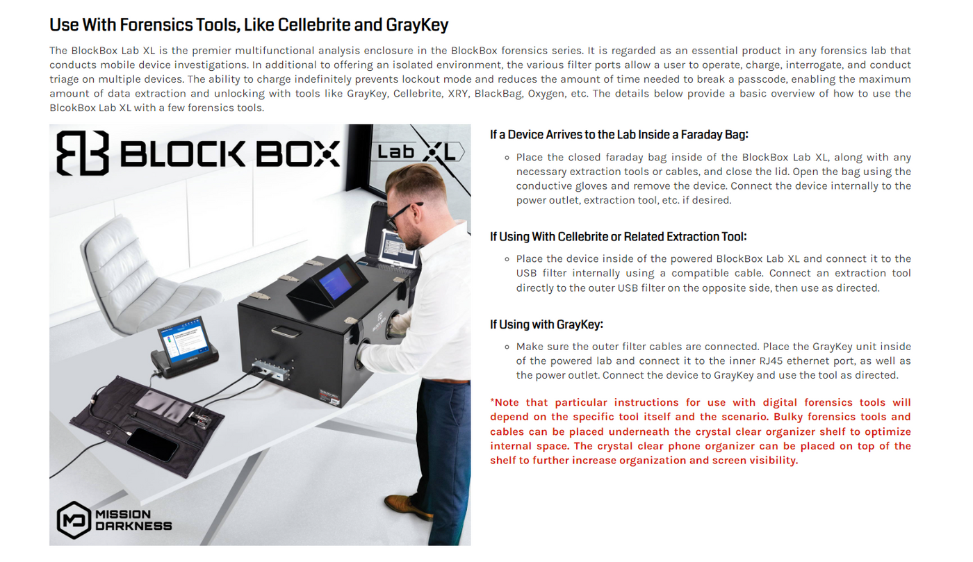 Brukere kan trygt overføre beslaglagte eller innsamlede enheter fra individuelle faraday-poser til BlockBox Lab XL uten å bryte RF-skjermingen. Når lokket er lukket, kan posen åpnes inni. Mission Darkness NeoLok Faraday-poser med magnetisk lukking (som posene inkludert i settet) anbefales ved bruk av ledende hansker, da de eliminerer risikoen for å punktere hansker med saks (ofte brukt til å klippe opp faraday-poser) eller kraftig borrelås (brukt i de fleste standard faraday-poselukkinger).