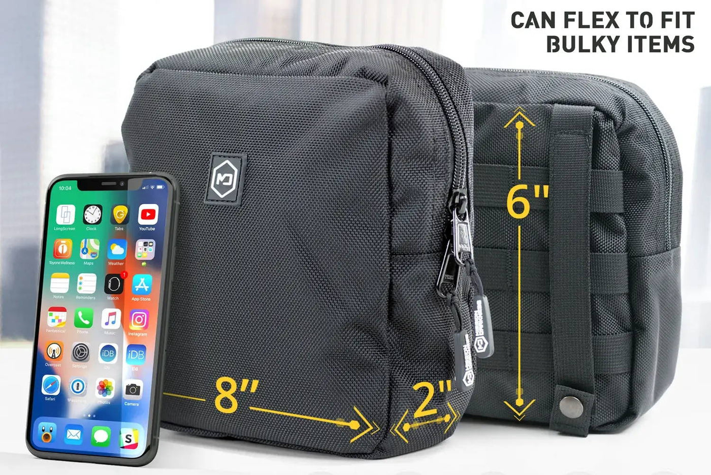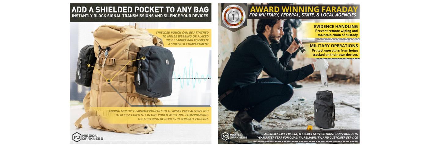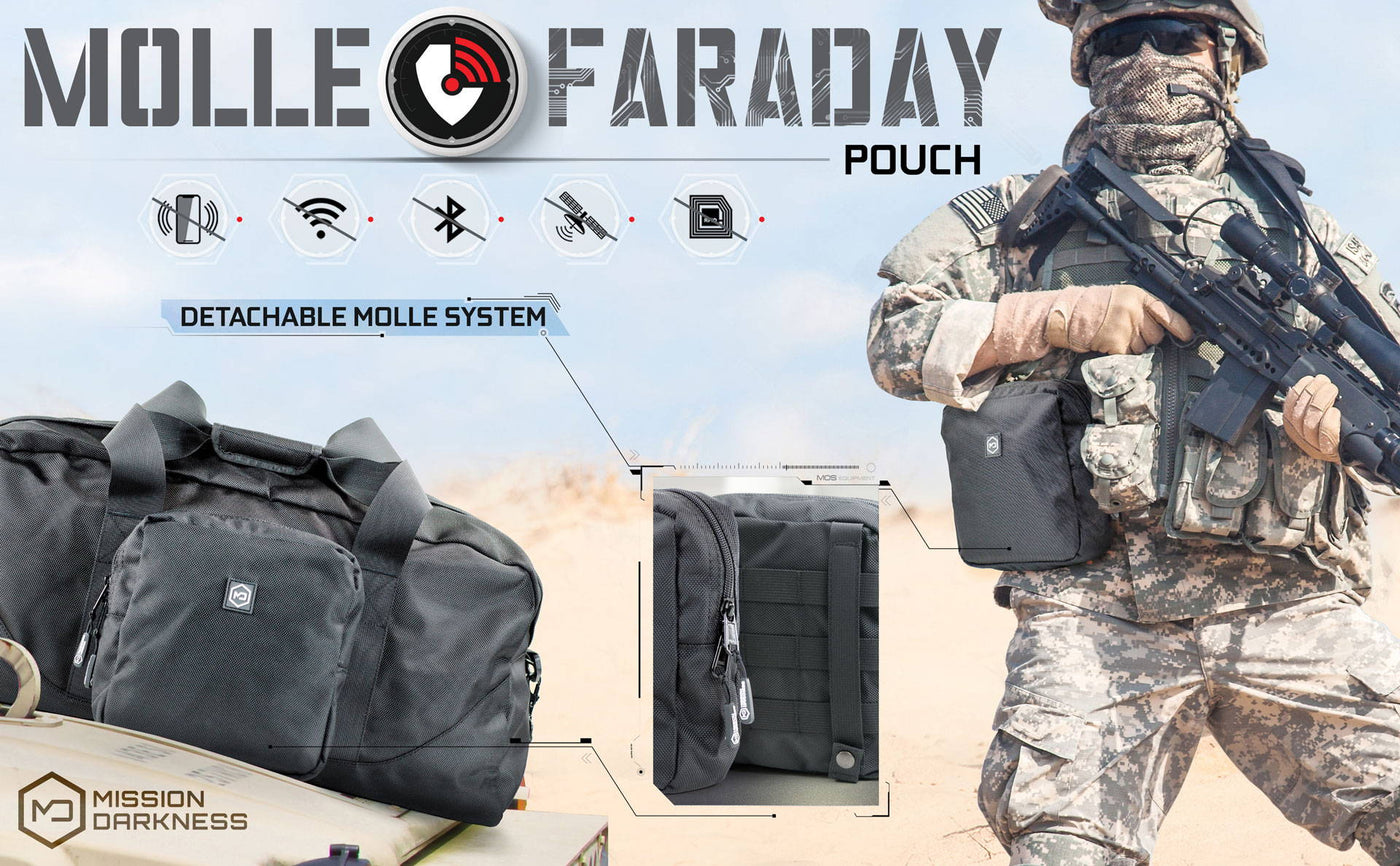 Mission Darkness™ MOLLE Faraday Pouch blokkerer alle trådløse signaler og holder små til mellomstore elektroniske enheter skjermet for å forhindre hacking, sporing, overvåking og kompromittering av beviskjeden. Når en enhet er riktig plassert i bagen, kan ingen apper eller ondsinnet kode fjernaktiveres eller slettes. Ingen kommunikasjon kan trenge gjennom, og ingen kan få tilgang til mikrofon, kamera, GPS-posisjon eller data. Bagen brukes primært av politi og militære for innsamling av kriminaltekniske bevis, forsvar mot datatyveri, personlig sikkerhet, EMP-beskyttelse og for å styrke digitalt personvern.